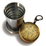 A telescoping steel shot glass with a hand finished, antique brass cap that collapses down to fit in your pocket! Always be prepared with The Gentleman's Portable Shot Glass, by Trixie & Milo. Conveniently sized to fit into your pocket, with a chain and clasp to hang it from your key ring - take it with you wherever you may roam.