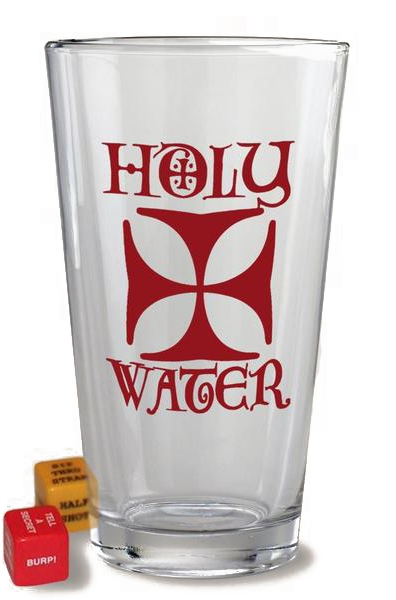 Now you can drink your "Holy Water" from this sanctified pint glass. Could come in handy for frightening off vampires as well.