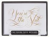 Delightfully irreverent and classy, this notecard set offers 4 different greeting-all rendered in beautiful hand-drawn calligraphy and foil-stamped on uncoated card stock. Perfect for expressing sentiments with humour and style.