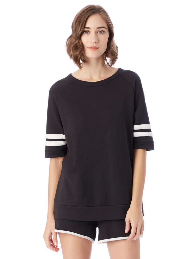 The short-sleeved crew neck and sweatshirt material make this ultra-soft top a great choice for working out or just hanging out. Raglan sleeves and arm detailing give it a vintage sporty style.