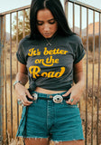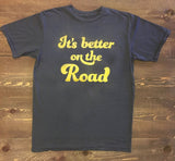 For our fellow road trippers....cuz it's better on the road. Super soft and comfy "vintage" black tee with golden yellow print on front. Blank back. Relaxed fit. This style is unisex and can be worn by both men and women.
