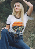 We've got those California desert vibes with our Joshua Tree ringer t-shirt. Tee is a natural white with contrasting brown ringer neck and sleeves. 70's inspired graphic and colour scheme. Joshua Tree, California print. Blank back. Printed on fitted tees. We suggest sizing up if you are in between sizes or prefer a looser fit.