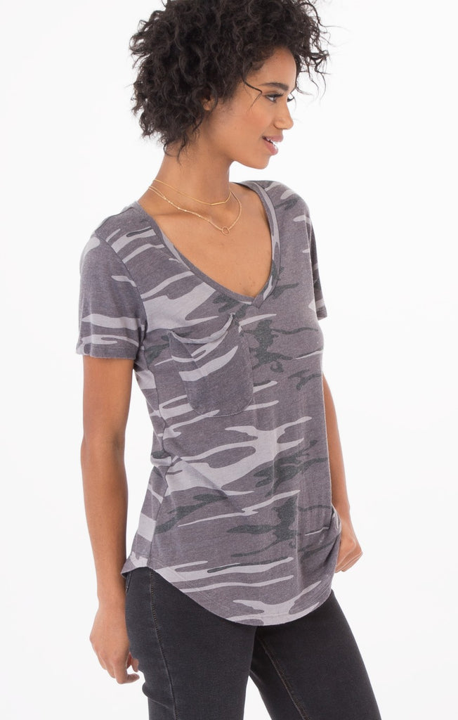 Your favorite tee can now be found in our most coveted camo print. Crafted from our ultra-soft hacci knit fabric to achieve a broken-in vintage look, this tee features a curved v-neckline and a slouchy raw edge pocket.