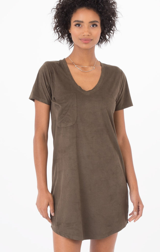 Your t-shirt dress just got a makeover. The Faux Suede Dress is made from an ultra soft & lightweight faux suede, featuring a curved v-neck and a slouched, raw edge pocket. Say hello to your new everyday favorite.