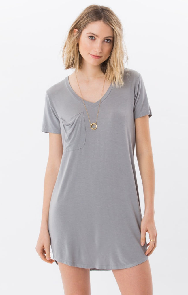 Our Pocket Tee gets a makeover as a brand new dress. Crafted from our smooth and silky Sleek Jersey fabric, this T-shirt dress features short sleeves, a curved V-neckline, a slouchy front chest pocket, and a curved hem.