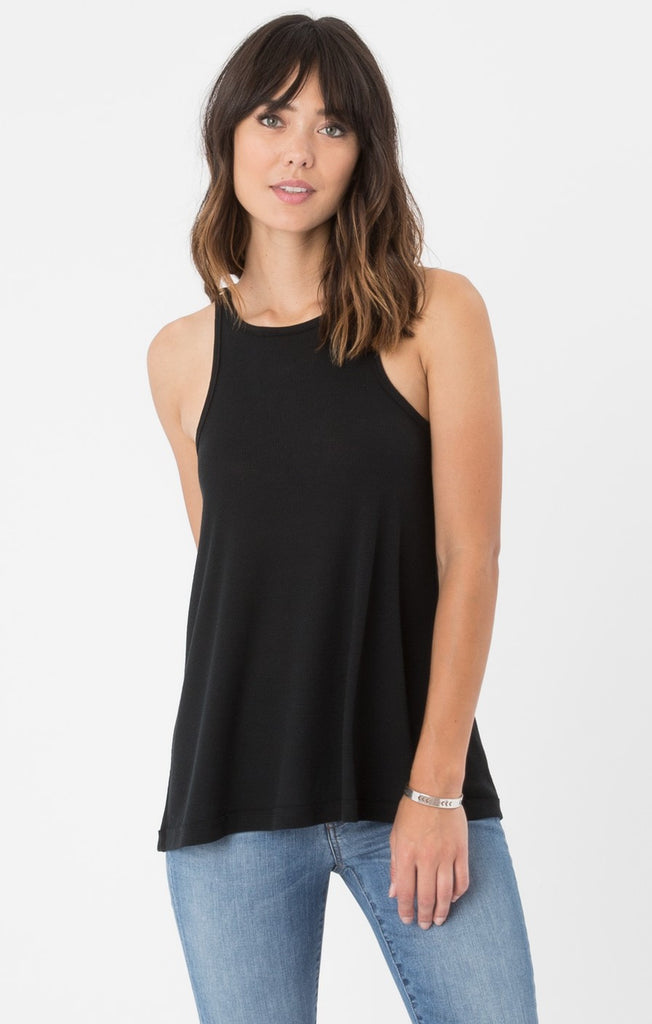 Made to flatter every body type, this irresistibly comfortable tank is crafted from a lightweight ribbed knit. Featuring a high neckline, a racerback with back pleat, exposed raw edge seam detailing and straight hemline.