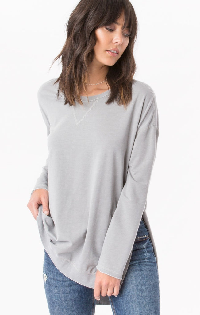 Your favorite go-to sweater has arrived. Crafted from our burnout baby French terry, fabric, this pullover features an exaggerated side slit, a neckline triangle stitch and high-low hem.
