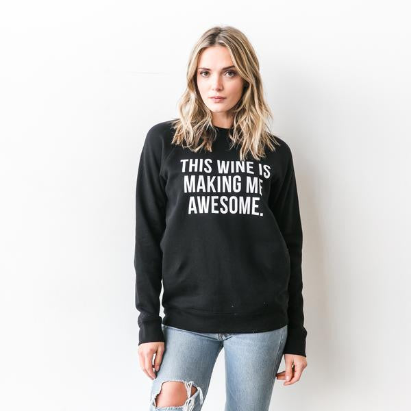 "This Wine Is Making Me Awesome" long sleeve crew neck sweatshirts. We fit to be cozy.