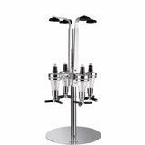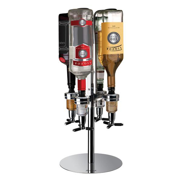 Give a toast with this four bottle revolving liquor dispenser. Your liquor of choice is gravity fed into each of the four dispensers. Simply push up to dispense a forfeit 1.5oz shot ever time. The weighted chrome finished base will look great in any setting.