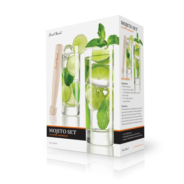 This all-in-one mojito set has the tools you need to make the perfect mojito. Includes two classic tom collins glasses and a wooden muddler for crushing ingredients.