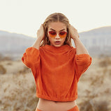 These feminine sunnies feature metal frames, cat eye mirrored lenses and adjustable nose pads for no-slip wear.
