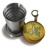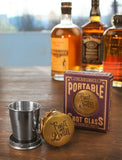 A telescoping steel shot glass with a hand finished, antique brass cap that collapses down to fit in your pocket! Always be prepared with The Gentleman's Portable Shot Glass, by Trixie & Milo. Conveniently sized to fit into your pocket, with a chain and clasp to hang it from your key ring - take it with you wherever you may roam.