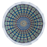 Shades of blue, teal and tan blanket with white tassels - 100% cotton, measures 72" diameter