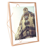 Add new dimension to your photo displays with this prismatic, 8x10" black wire frame, in which a photo floats between two parties of glass. Can alternately sit on the desk or be hung on the wall