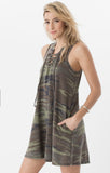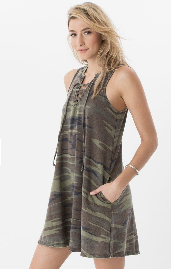 Your favorite is our favorite. Now in our most coveted print, our Camo All Tied Up Dress is this season's highlight. Made from our signature burnout Baby French Terry, this dress features an easy swing silhouette, front lace up detail and side pockets.