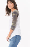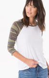 Hit it out of the park in our baseball tee crafted from our Signature Burnout. Featuring 3/4 contrast raglan sleeves in camo print, a rounded neckline, and relaxed fit.