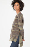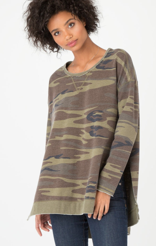 Your favorite is back in camo. Crafted from our baby French Terry Burnout Fabric. This pullover features an all over camo print, exaggerated side slits, neckline triangle stitch, and a high-low hem.