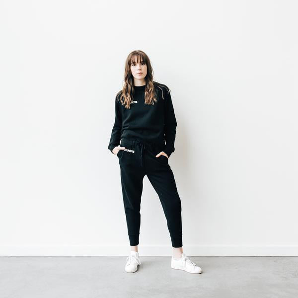 We are VERY excited that we finally have an excuse to wear sweatpants...ALL THE TIME. Our middle sister jogger has a slight dropped crotch, and is the perfect balance between fashion and comfort. With a slight cropped bottom, they can fit all body types. And, the icing on the cake is the chain stitched "Brunette" on the top right hand (just below the waist band).