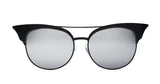 These statement-making sunnies feature an exaggerated sharp cat eye metal half-frame with double bridge, mirrored lenses and matte black plastic arms